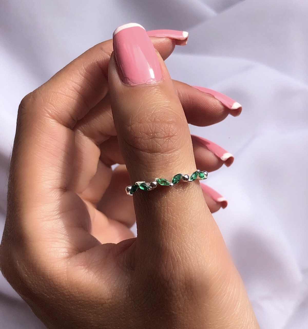 Anillo elaborado en plata 9.25 con pequeños circones verdes.