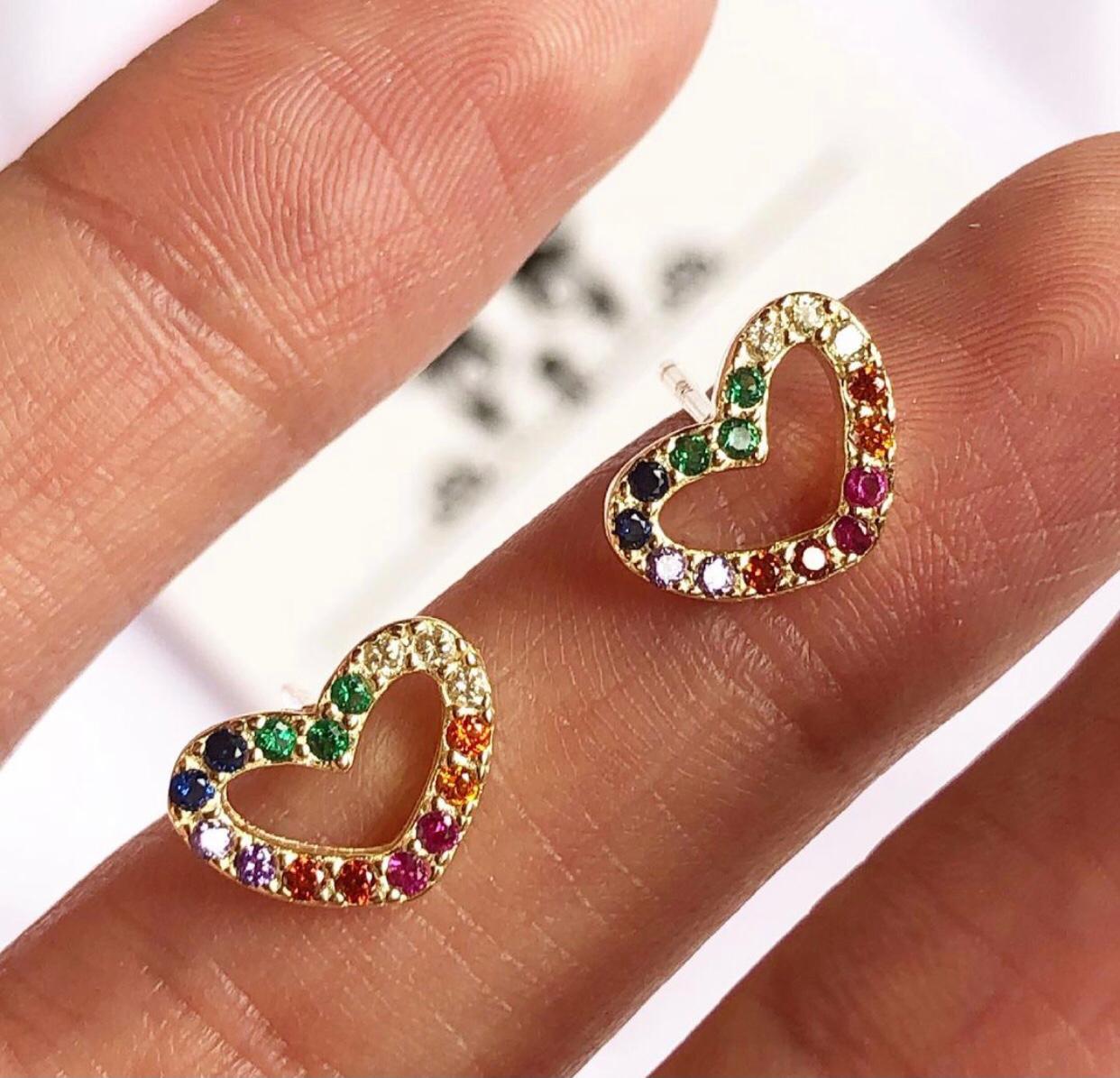 Aretes en forma de corazón elaborados en plata dorada con circones de colores.